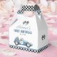 These fun birthday party favor boxes feature a vintage blue race car and chequered flags. Personalized with your birthday party details and thank yo message on the reverse. Designed by Thisisnotme©
