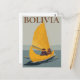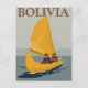 This vintage-style travel poster captures the unique culture and landscape of Bolivia. The design features two figures in traditional dress sailing in a striking yellow reed boat, with the calm waters of Lake Titicaca behind them. The art style, with its simplified forms and muted colour palette, evokes the classic and nostalgic feel of mid-century travel advertising.