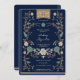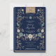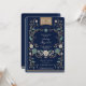 This navy and gold baptism invitation is designed to look like an old vintage book cover. The invitation features an elegant navy blue background with gold floral designs, giving it a luxurious and refined look. The typography used is traditional and in gold colour, adding to the vintage feel of the invitation. The invitation card is designed to look like an old book cover, with the floral designs adding a touch of elegance and femininity. The colour combination of navy blue and gold gives it a sophisticated and timeless look that would be perfect for a formal or vintage-themed event.