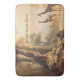 Vintage botanical painting of three giraffes by a river in the jungle during sunset