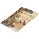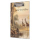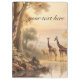 Vintage botanical painting of three giraffes by a river in the jungle during sunset