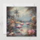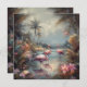 botanical painting with flamingos standing in the water surrounded by palm trees and tropical flowers