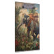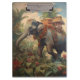 vintage painting of a botanical scene with an elephant carrying a howdah walking through a river with a indian palace in the back surrounded by exotic plants and trees