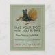This postcard is a photo reproduction of a vintage British Rail poster, encouraging travelers to take their dogs along. It features a well behaved Scottish Terrier, with suitcase and golf clubs.