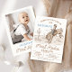 Boy's first rodeo themed first birthday invitation featuring a cowboy and horse, desert landscape, and some rope style text. This boy's first rodeo birthday invitation also features a photo on the back and is ideal for anyone looking for a vintage style invitation.