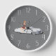 Vintage 1940s/50s white Buick convertible (made famous in the movie Rainman) with red haired pinup girl perched on door, with white clock face on medium grey background