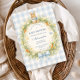 A charming vintage baby shower design featuring a sweet watercolor bunny resting above a delicate spring garden wreath. Soft daisies, greenery, and tiny carrots form a whimsical botanical frame, finished with a gentle ribbon bow and a soft blue gingham background. The storybook illustration style and pastel countryside palette create a timeless cottagecore aesthetic that feels warm, playful, and perfect for celebrating a new little arrival.