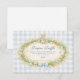 A charming vintage baby shower design featuring a sweet watercolor bunny resting above a delicate spring garden wreath. Soft daisies, greenery, and tiny carrots form a whimsical botanical frame, finished with a gentle ribbon bow and a soft blue gingham background. The storybook illustration style and pastel countryside palette create a timeless cottagecore aesthetic that feels warm, playful, and perfect for celebrating a new little arrival.