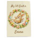 This charming vintage-style Easter design features a joyful bunny surrounded by delicate spring flowers and pastel Easter eggs, creating a timeless and heartwarming look. Designed especially for children, it includes the option to add a personalized name with the phrase “Name First Easter,” making it perfect for celebrating a baby’s very first Easter. Soft watercolor textures and classic storybook-inspired details give the artwork a nostalgic, gentle feel that suits a wide variety of kids’ products. Ideal for baby apparel, nursery décor, keepsakes, and Easter gifts, this design captures the innocence, happiness, and tradition of Easter in a sweet vintage style made to be treasured.