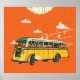 Vintage illustration with bus on clouds. Nostalgic road trip feels!