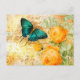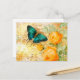 Vintage turquoise butterfly with yellow to cream orange roses on antiqued background.