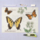 This decoupage paper features three common butterflies: the Eastern Tiger Swallowtail, the Painted Lady and the Monarch arranged on a page like specimens with scientific name labels. Includes French script and white wildflowers.