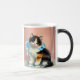 Magic Mug featuring a cute calico kitten. The kitten wears a blue ribbon while sitting adorably on a table. A perfect gift for cat lovers and Victorian art enthusiasts!