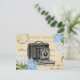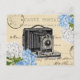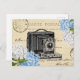 A great vintage camera with beautiful blue and white vintage hydrangeas and leaves is set on a vintage French postcard in sepia cream with handwriting and postmarks to make a lovely floral French themed postcard..