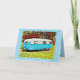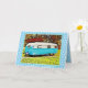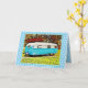 Bright and cheerful vintage camper trailer card with a fun light blue patterned background. Inside reads "hello friend, sending you love and want you to know I'm thinking of you". This card is easily personalised.
