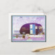 Summer fun postcard, featuring a vintage camper trailer with a picnic table. The unusual colours give the retro scene a dreamy edge.