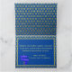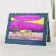 A vintage camper van, parked in a meadow with trees and mountains in the distance. The peaceful scene has been transformed with bright colourful drama. Yellow, fuchsia and light pink are the predominant colours in this vibrant work of art. A fun geometrical pattern background, in teal blue and gold, provides the grand finale. This fun card includes templates for names, date, and greeting. The inside greeting default is: Happy Birthday happy camper. May you have many enjoyable adventures ahead of you. There is also a road sign inside that reads: Adventure.