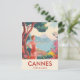 This vintage-style travel poster captures the glamour and beauty of Cannes on the French Riviera. The design features a woman in a red swimsuit overlooking the sparkling Mediterranean Sea, dotted with sailboats. The scene is framed by lush, colourful flowers and trees, with the rolling hills of the Côte d'Azur in the background. The art style, with its vibrant colours and nostalgic feel, evokes a classic, retro vacation vibe.
