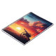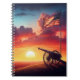 An old cannon is silhouetted against a vibrant sunset with the American flag waving beside it