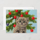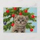 Postcard featuring a vintage cat and Christmas tree! A fluffy grey kitten adorably sits in front of a green Christmas tree. The tree is decorated in red and blue ornaments. A cosy gift for the Christmas season and cat lovers!