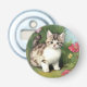 Bottle Opener featuring a vintage kitten illustration. A fluffy white cat with dark stripes plays in a patch of grass with red flowers. A cute gift for cat lovers and Victorian art collectors.