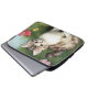 Laptop Sleeve featuring a vintage kitten illustration. A fluffy white cat with dark stripes plays in a patch of grass with red flowers. A cute gift for cat lovers and Victorian art collectors.