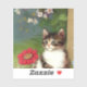 Sticker featuring a cute kitten illustration. A white cat with dark brown stripes relaxes in a garden of spring flowers. A perfect gift for cat lovers!