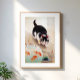 Vintage Japanese cat looking at gold fish in a bowl illustration wall art poster. Black and white cat/kitten.