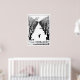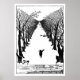A black and white poster for cat lovers featuring a pen and ink drawing of a black cat waving his wild tail as he walks through snowy woods. The freedom loving feline stars in the children's story The Cat That Walks By Himself by Rudyard Kipling first featured in the 1902 edition of his Just So stories for children. Unlike the dog, the independent moggy refuses to be tamed by Man or Woman, announcing: 'I am not a friend and I am not a servant. I am the Cat who walks by himself and all places are alike to me.' Below the main drawing is a sketch of the landscape with the cave where Man and Woman live and which the cat turns up his nose at. Man is riding his horse calling on the Dog servant to come to heel. You can add a colour border to suit with the customise button.