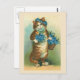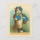 Charming vintage image of a ginger and white cat carrying a basket of forget-me-not flowers and wearing a flower wreath on his head. He has a green ribbon around his neck and is wearing a tiny pair of clogs.