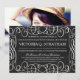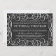 Vintage chalkboard themed bat mitzvah invites are stylish and romantic. They feature modern typography and an ornate flourish frame over a chalkboard or blackboard background in a black and white colour scheme.