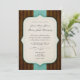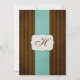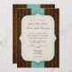 This design features a rich chocolate brown striped background, and a simple, elegant cut-out cream frame placed over a blue ribbon. The text alternates between classic Garamond and script wedding fonts, with an added script flourish for style in between the wedding date and location. The design has been given a distressed, aged feel to complement the vintage design. A custom monogram initial in its own, smaller frame ties the back of the invitation card into the overall design. These invitations are classic but not overly formal, exuding a vintage, old-fashioned charm with a contemporary sweetness and style.