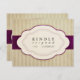 This wedding invitation response card features a striped aubergine and cream background on which an aubergine purple ribbon bears a white emblem with scalloped edges. This curved, symmetrical form, which looks like a paper cut-out, frames the words "Kindly respond [by - customisable date]" with a swirly script flourish on the front. On the back is a line for the guest to write their name and check whether they accept or decline, and the number of guests attending. The design has a distressed, vintage, aged feel which complements the theme of simple, old-fashioned elegance.