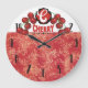 Vintage style cherries fruit emblem with C monogram, bold numbers and red damask background on this kitchen clock for cherry lovers.
