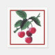 Package of 50 white paper cocktail napkins with a vintage 1940s image of red cherries. Red border. See matching cloth napkin, kitchen towel, cloth placemat, paper placemat and coasters. See the entire Patriotic 40s Napkin collection in the FOOD/BEV | Linens section.