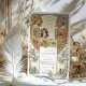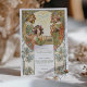 Add a touch of vintage elegance to your wedding with our Elegant Art Nouveau Wedding Menu Card. Featuring a stunning illustration inspired by the Art Nouveau movement, this card displays intricate floral motifs and graceful figures in rich hues of gold, sage green, and coral. The front lists a delectable selection of appetizers, main courses, and desserts in an elegant serif font, perfectly framed by the detailed artwork. The back continues the theme with a beautiful floral emblem, making this menu card a sophisticated addition to any wedding reception.