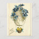 This postcard features a vintage illustration of chicks in a hot air balloon made of an eggshell. Blue violets sit on top of it.