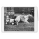 A vintage photograph of a small child in a toy car being pulled by the family's pet dog. This card is blank inside for your own message.