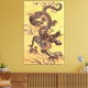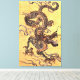 The dragon is highly detailed and depicted in a powerful, coiled, and sinuous pose, moving vigorously. It has dark brown/black scales, claws, and a fierce, open-mouthed expression showing its teeth and tongue. The background is a bright, solid golden yellow color with a slightly muted, antique look, enhancing the vintage aesthetic of the artwork. (images are either public domain, created by me, or licensed for use)