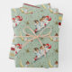 This design features a whimsical, vintage-inspired holiday motif. The pale blue-green background is adorned with scattered golden stars and twinkling flecks. The primary elements are large glittery golden crescent moon and a stylised, red and white striped candy canes that function as a slide. Small angels, which are wearing white, are depicted in two poses: one angel sits on the tip of the crescent moon, and a group of three angels are sitting on the candy cane, creating a playful and nostalgic texture suitable for wrapping paper or fabric.
