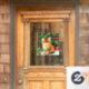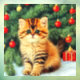 Window Cling featuring a vintage Christmas cat! An orange kitty with black stripes sits in the snow. Behind the cat is a Christmas tree with red and yellow ornaments. Also on the snow is a red present. A perfect gift for the Christmas season and cat lovers!
