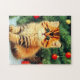 Puzzle featuring a vintage Christmas cat! An orange kitty with black stripes sits in the snow. Behind the cat is a Christmas tree with red and yellow ornaments. Also on the snow is a red present. A perfect gift for the Christmas season and cat lovers!