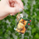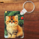 Keychain featuring a vintage Christmas cat! An orange kitty with black stripes sits in the snow. Behind the cat is a Christmas tree with red and yellow ornaments. Also on the snow is a red present. A perfect gift for the Christmas season and cat lovers!