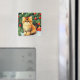 Magnet featuring a vintage Christmas cat! An orange kitty with black stripes sits in the snow. Behind the cat is a Christmas tree with red and yellow ornaments. Also on the snow is a red present. A perfect gift for the Christmas season and cat lovers!