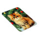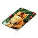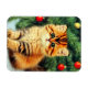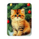 Magnet featuring a vintage Christmas cat! An orange kitty with black stripes sits in the snow. Behind the cat is a Christmas tree with red and yellow ornaments. Also on the snow is a red present. A perfect gift for the Christmas season and cat lovers!