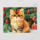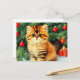 Postcard featuring a vintage Christmas cat! An orange kitty with black stripes sits in the snow. Behind the cat is a Christmas tree with red and yellow ornaments. Also on the snow is a red present. A perfect gift for the Christmas season and cat lovers!