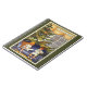 Vintage illustration Victorian Christmas holiday image featuring happy siblings sitting on a couch. A brother and sister on a sofa have a decorated Christmas tree and window behind them. The girl is reading a book and the boy is eating a candy cane. Text reads "A Merry Christmas."