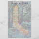Vintage illustration Christmas holiday religious design featuring an architectural element, a stained glass window snowscape. A beautiful chapel with light coming through on the new fallen snow outside in the winter season landscape.