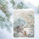 Adorable donkey nuzzling a kitten on a cold snow day with barns in the background. Sheet music and gold ornamental pieces included in this design. Perfect for sending Season's Greetings to anyone.
