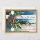 This vintage-designed invitation is perfect for a Christmas party or a holiday open house. The design features a winter landscape with holly leaves and red berries with a gold glitter border. The backside of the invitation is where you will personalise this template with your party information.